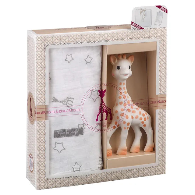 Thanks to this second gift set, it is possible to offer the Sophie La Girafe large swaddle providing multiple daily uses and the sweet Sophie la girafe.