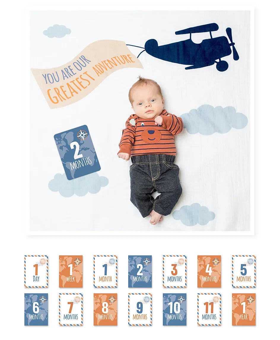 Includes: 1 large muslin blanket + 7 double-sided cards with 14 milestones.