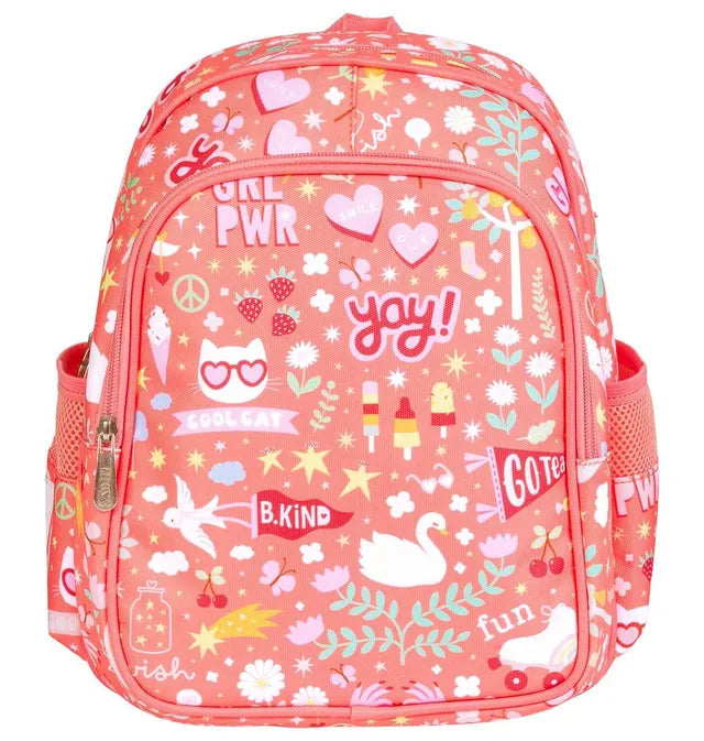 Lovely lightweight kids' backpack with an insulated front pocket that ensures snacks and drinks stay cold (or warm). The front pocket easily fits a lunch box, drink bottle, and added snacks or fruit. The main compartment is large enough for all your school essentials.