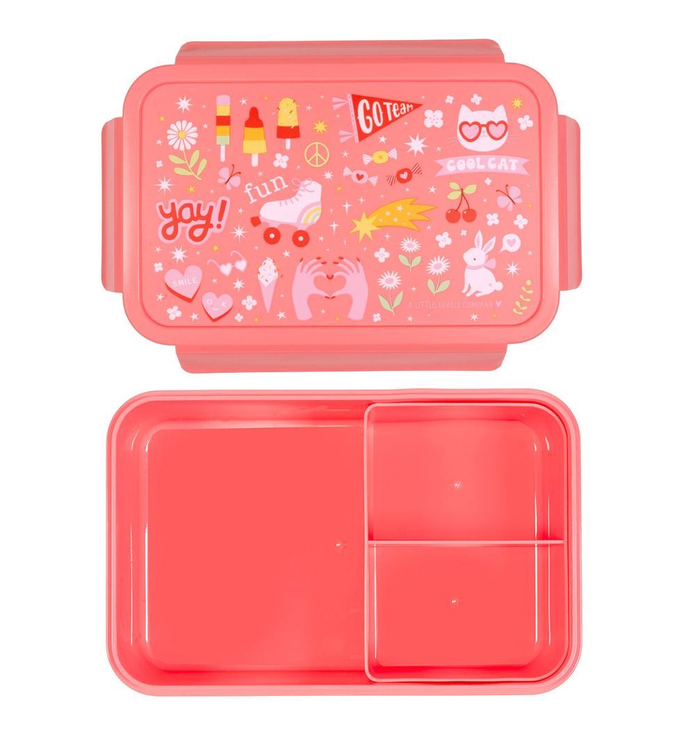 Spacious bento box with print. The airtight click & close lid is easy to open and close. The removable bento container with two compartments ensures a perfectly organized lunch. An ideal box for a fresh and varied lunch at school or on the road.