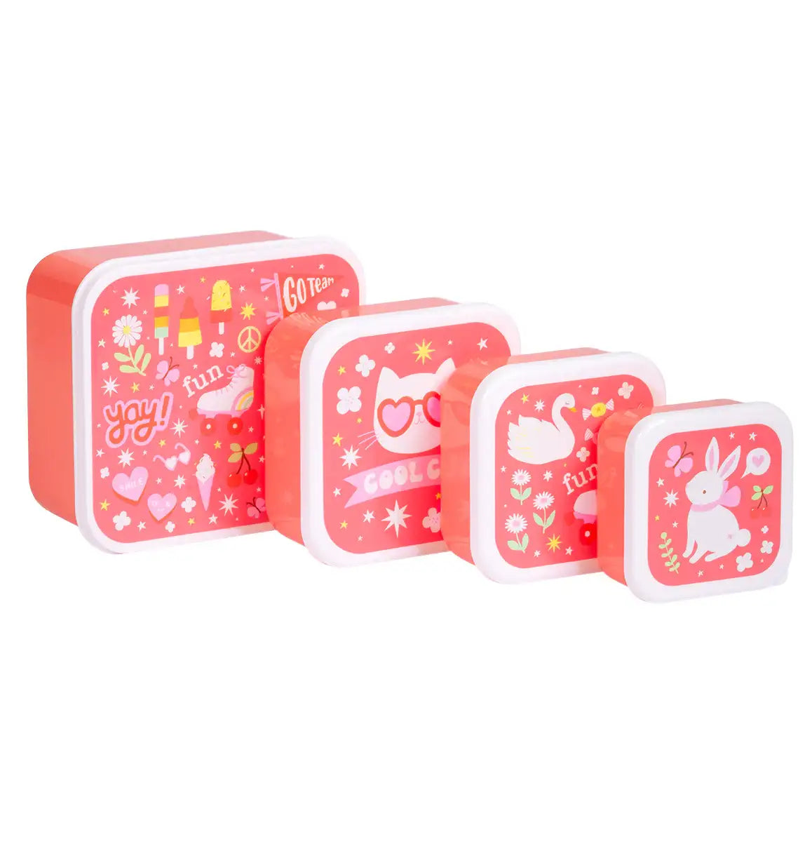 Keep your favorite snacks in this lunch & snack box set with wonderful themes. Fruit, veggies, cookies, and candy, as well as your sandwiches, can easily fit in one of these boxes. These lovely lunch & snack box sets include four different container sizes with a lovely design. Great for school lunches and snacks on the go.