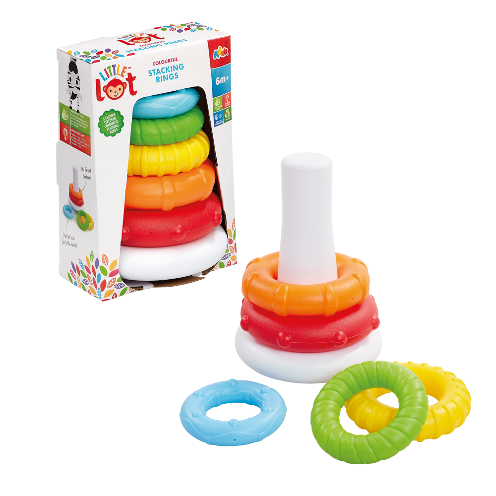 Toddlers will love stacking and sorting with this set of Colorful Stacking Rings from the Little Lot series.Watch as they sort the colorful rings into the stacking rod from the largest to the smallest, hitting the base that swings to see what happens as it shakes back and forth.This classic preschool game helps to develop your child's hand-wide coordination and fine motor skills in their early years, as it catches and explores the 5 colorful texture rings, which have the perfect size to play small hands