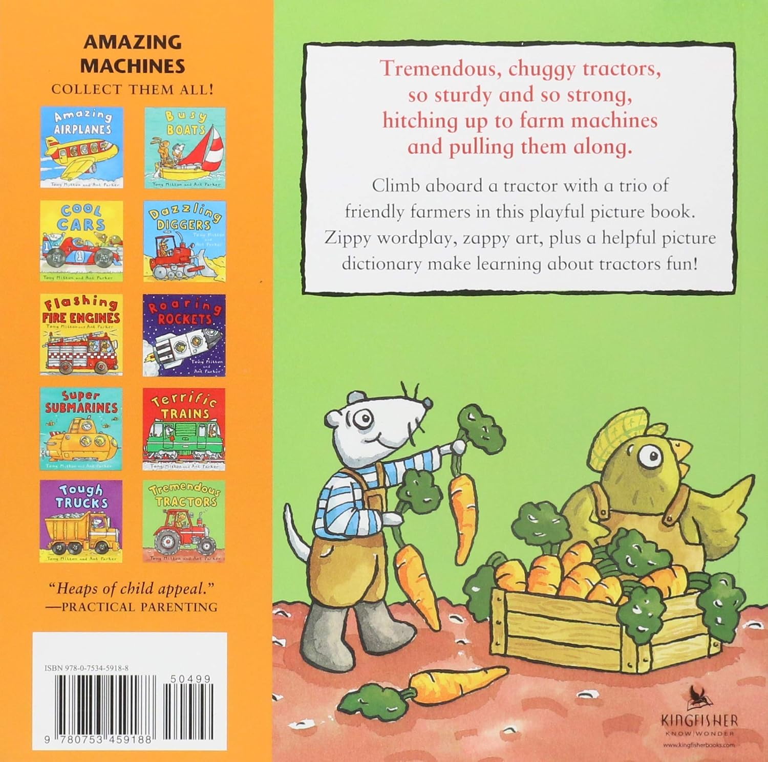 Tremendous, chuggy tractors, so sturdy and so strong, connecting up to farm machines and pulling them along. Climb aboard a tractor with a trio of friendly farmers in this playful picture book. Zippy wordplay, zappy art, plus a picture dictionary make learning about tractors fun!