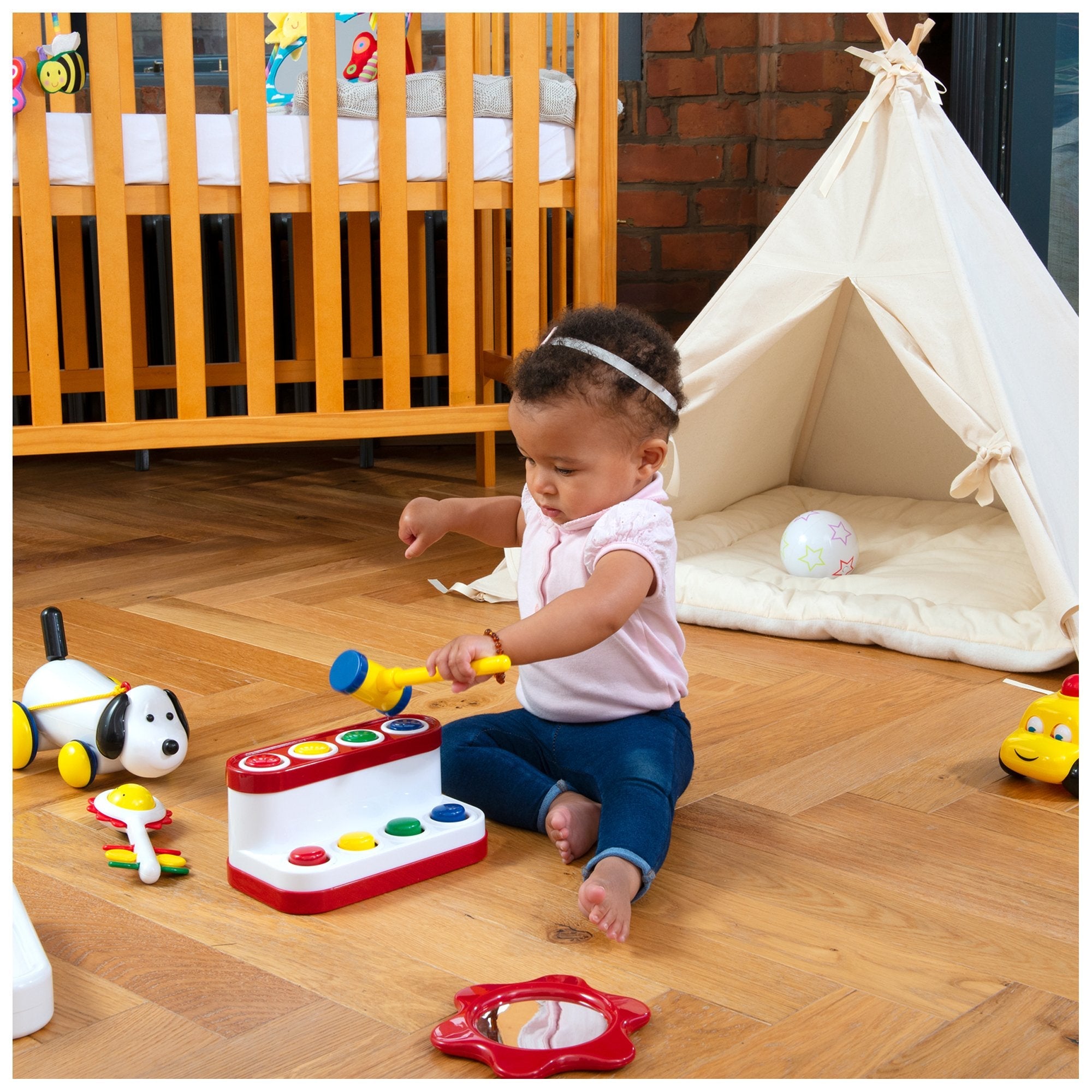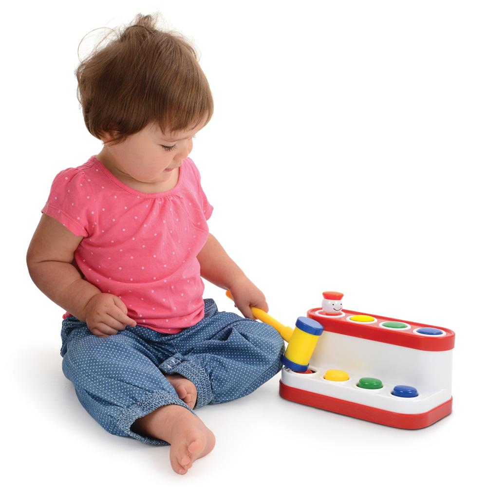 Ambi Plastic Pop-Up Pals Game with Hammer for Hand-Eye Coordination and Dexterity. Tap a button with the hammer and the matching colored pal pops up with this fun toy from AMBI. . Repeat the fun game of "peep-o" with the four smiley pals. Helps develop hand-eye coordination and manual dexterity.