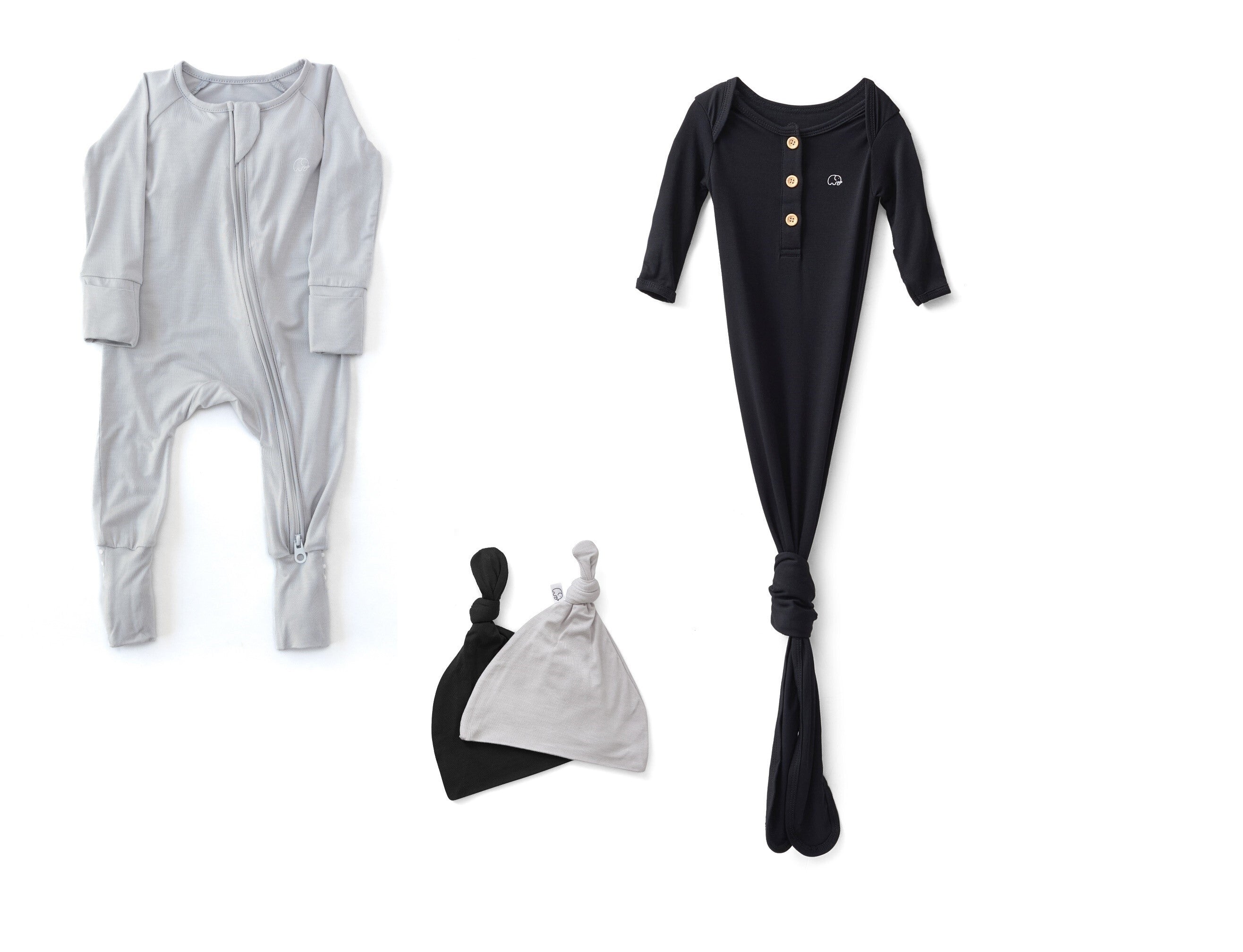 - Set includes a knotted gown, zipper romper, and matching hats