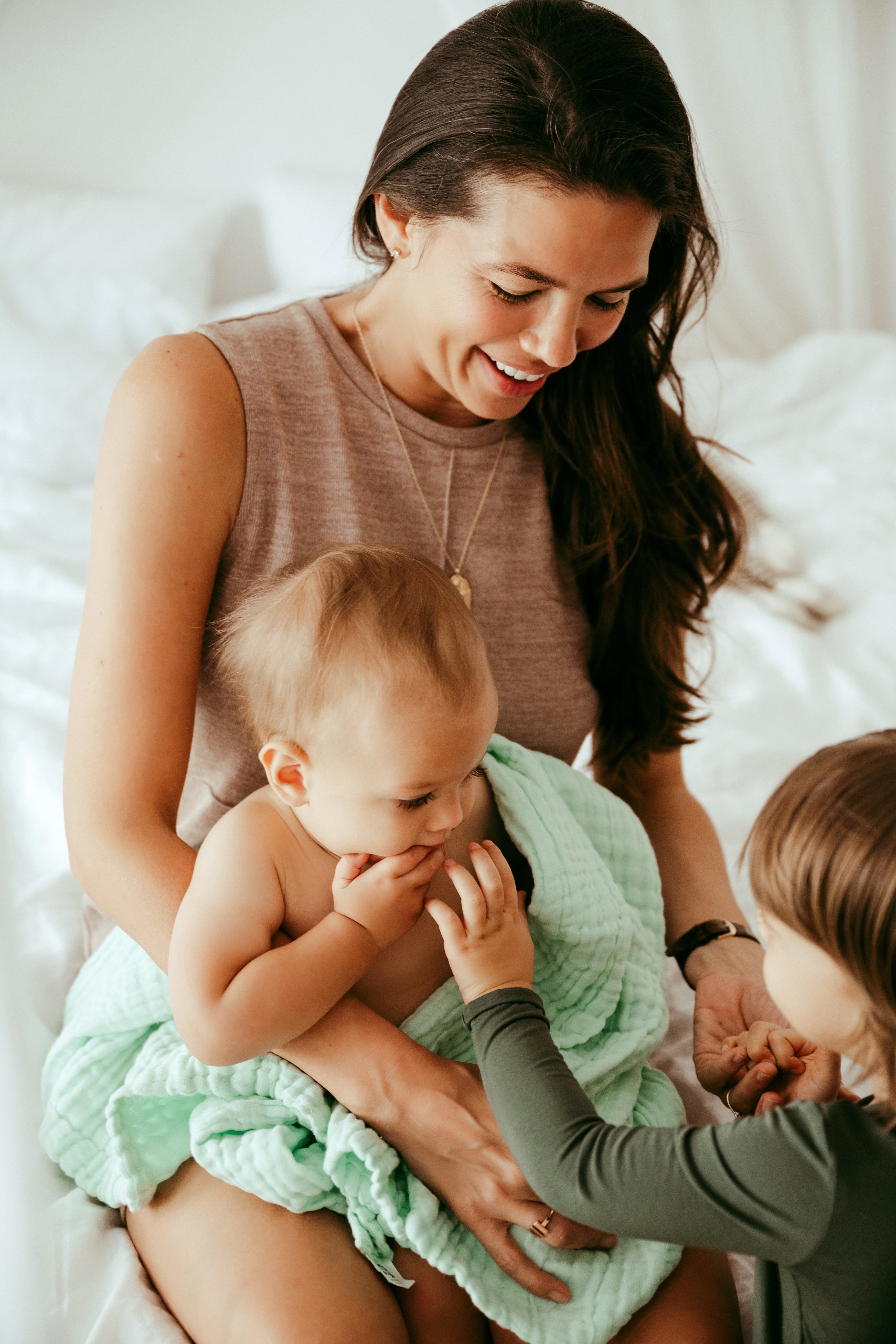 Anvi's Organic baby towel is made of 6-layered premium organic cotton muslin. This makes it softer. more comfortable, and ultra absorbent vs. standard towels. It also has the added benefit of being breathable and gets softer with every wash.
