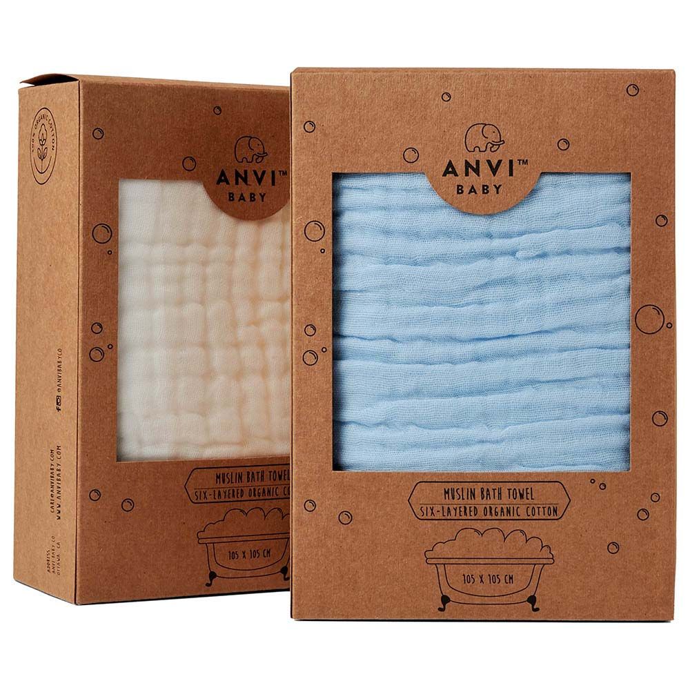Anvi's Organic baby towel is made of 6-layered premium organic cotton muslin. This makes it softer. more comfortable, and ultra absorbent vs. standard towels. It also has the added benefit of being breathable and gets softer with every wash.