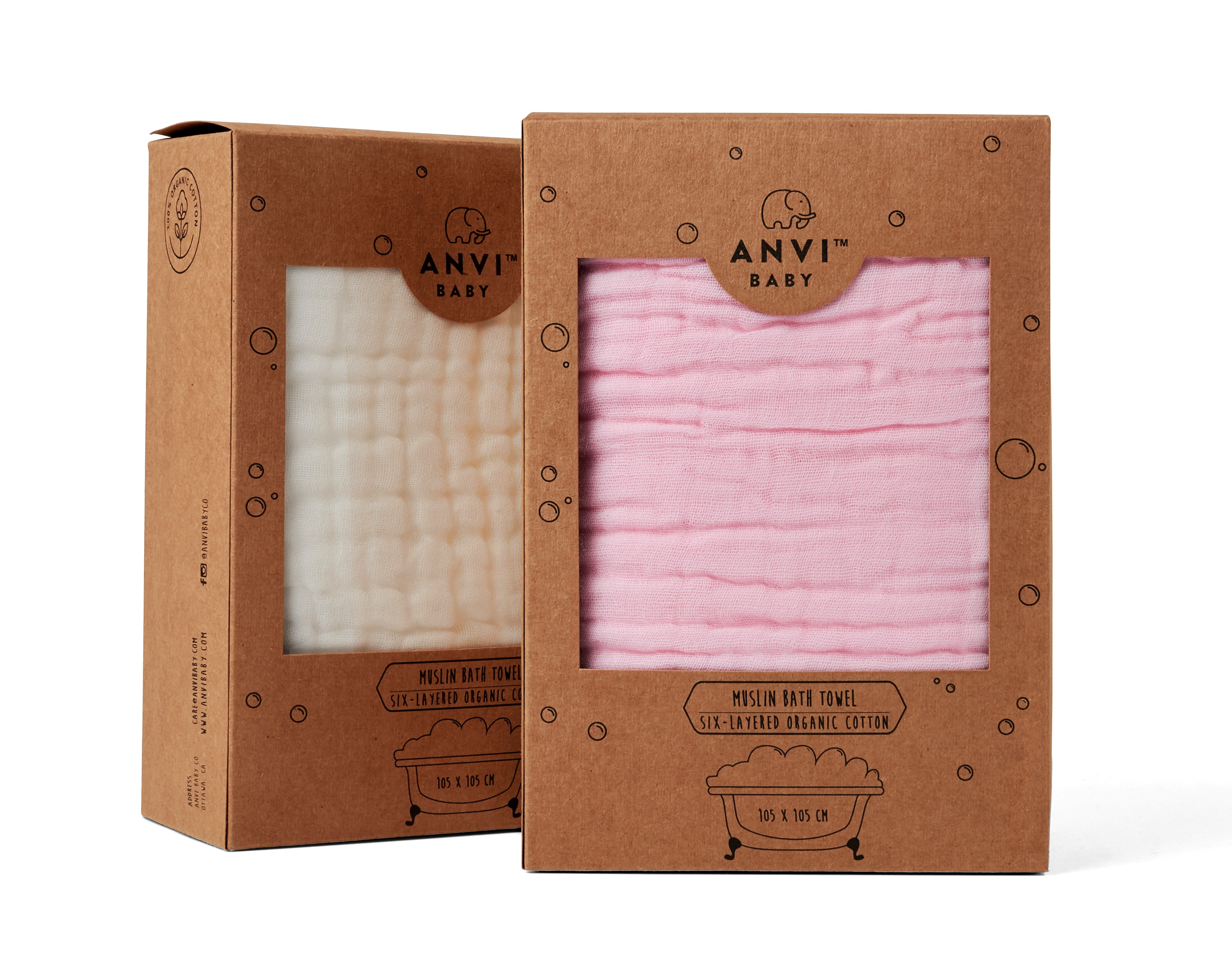 Anvi's Organic baby towel is made of 6-layered premium organic cotton muslin. This makes it softer, more comfortable, and ultra absorbent vs. standard towels. It also has the added benefit of being breathable and gets softer with every wash.