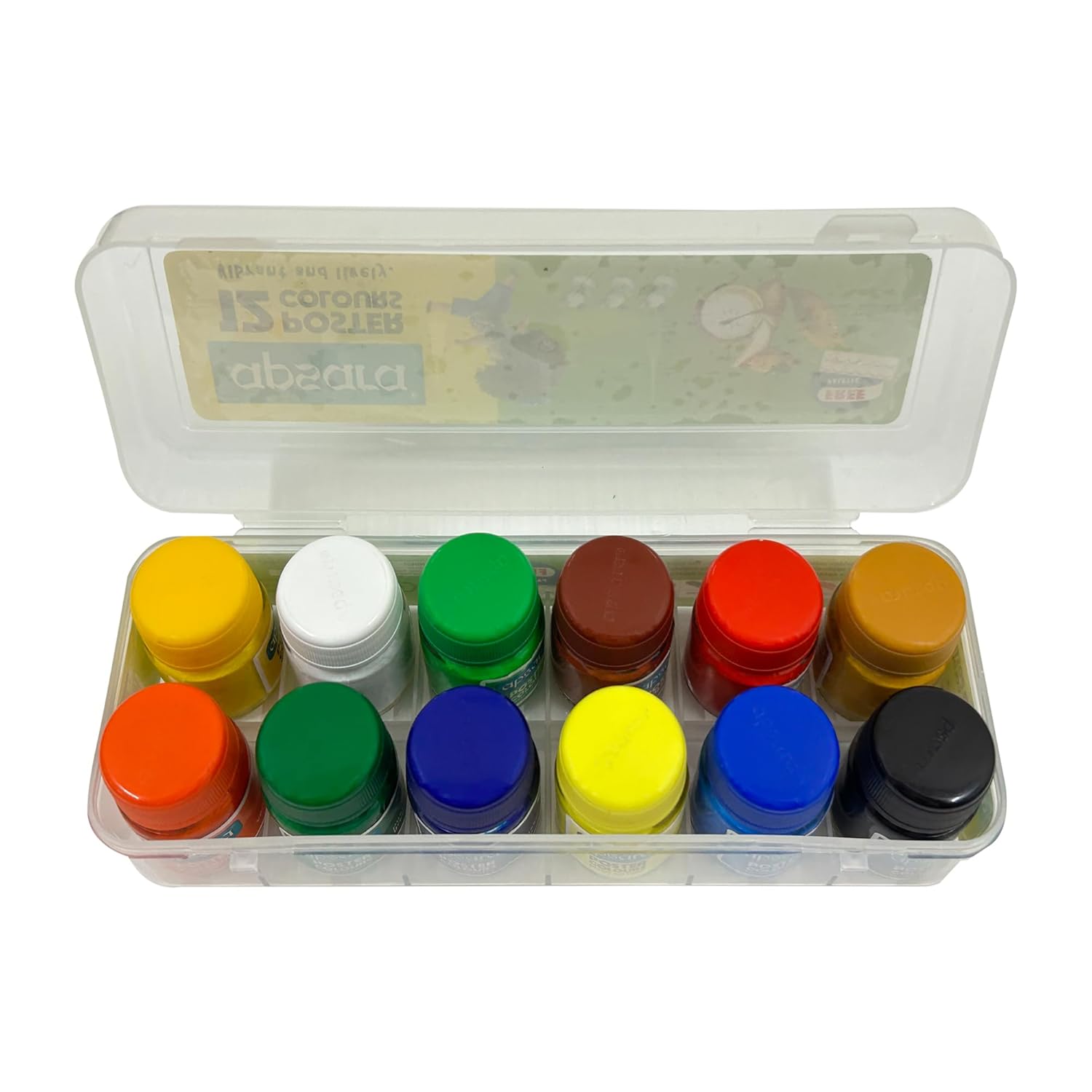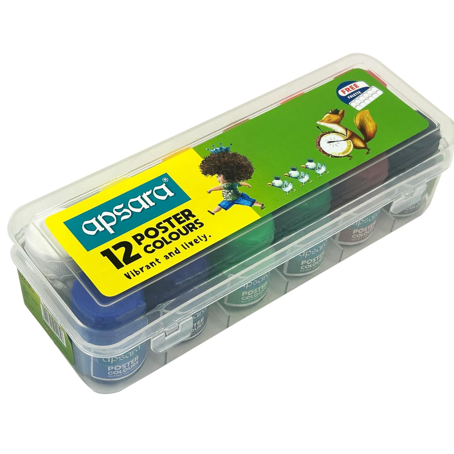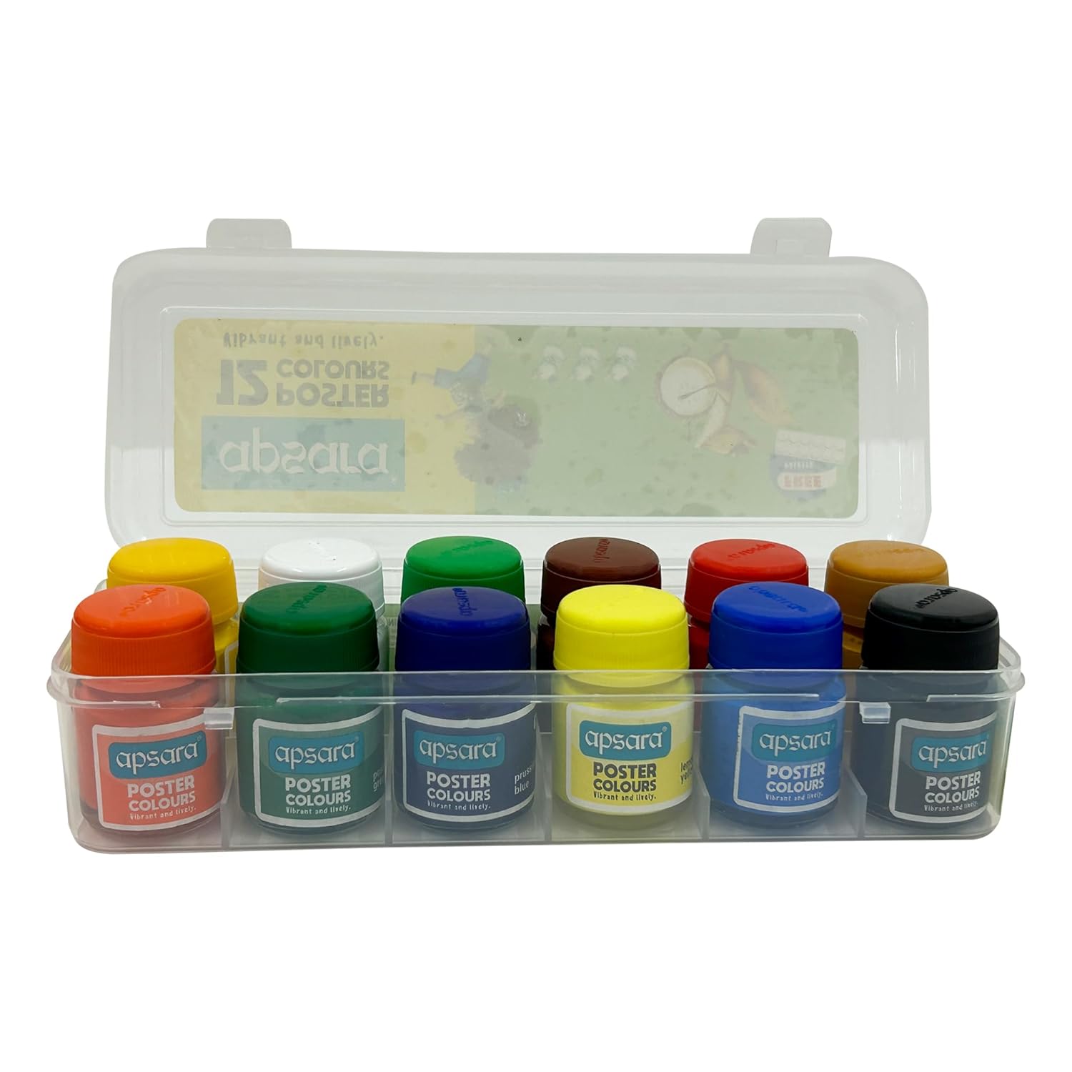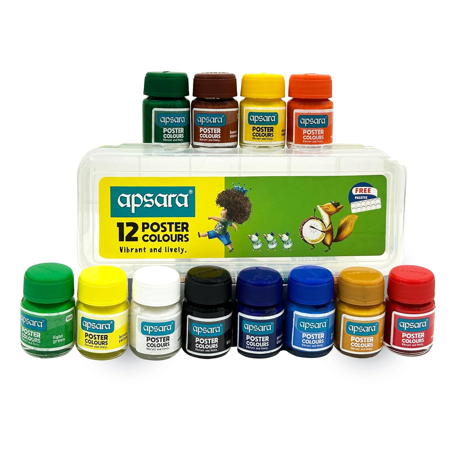 Apsara Poster Colour 12 shades | 10 ml in each bottle | Vibrant & Lively Colours | Smooth & Bright Colours | Durable plastic box | Free Palette