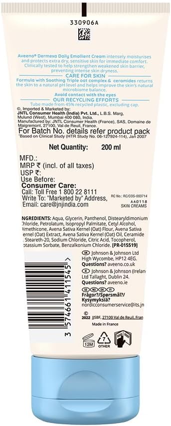 Developed with dermatologists specially for dry and irritated skin, AVEENO Dermexa Emollient Cream is a lightweight, non-greasy formula that combines the finely-milled Colloidal oatmeal to deliver intense moisture and hydration, whilst helping to strengthen the skin's natural barrier. AVEENO Dermexa Emollient Cream is clinically proven to address the five signs of very dry skin: roughness, redness, itching, tightness and scaling, leaving your skin feeling soothed, calm and restoring its long-lasting comfort. It also provides rapid relief for atopic-prone skin. For healthy and beautiful skin, use AVEENO Dermexa Emollient Cream!