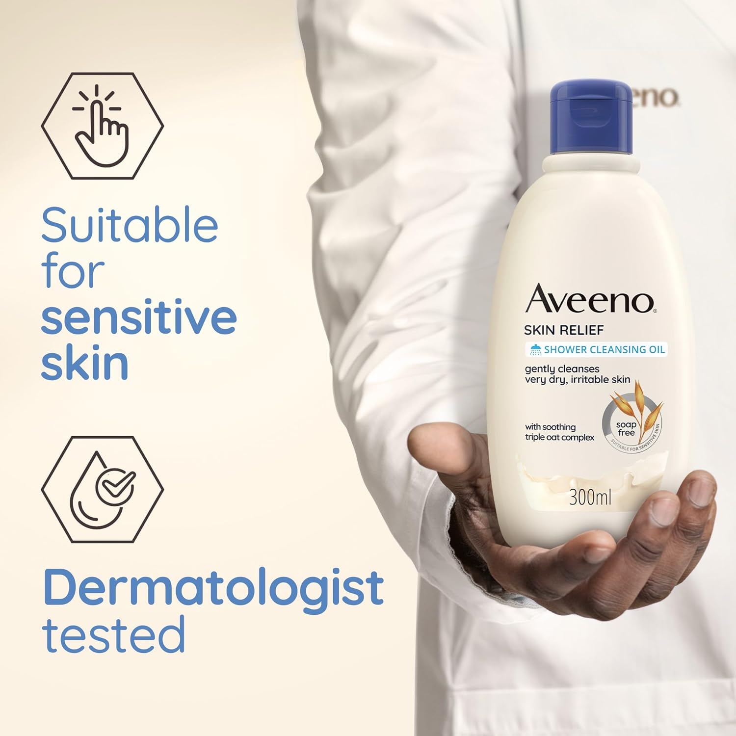 - Clinically proven to protect skin from dryness: Aveeno Skin Relief Shower Cleansing Oil contains triple oat complex that helps protect your skin against the drying effects of water while gently cleansing and soothing it.