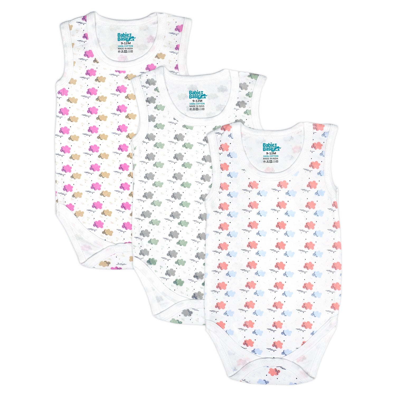 Babies Basic Clouds Printed Sleeveless Romper Bodysuit - Set of 3