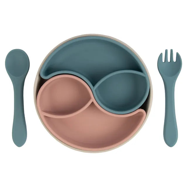 - Baby dinner set: Comes with three pieces: one suction divided plate; one Silicone Spoon; one Silicone fork