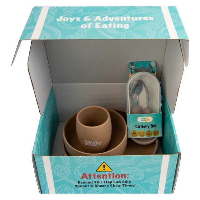 - Baby Dinner Set: Comes with five pieces: one suction plate; one silicone & stainless steel spoon; one silicone & stainless steel fork ; one suction bowl; one silicone cup.