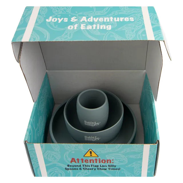 The Babies Basic 3 Piece Silicone Feeding Set is the perfect set for your little one's mealtime needs. Made with high-quality silicone, this set is safe, durable, and designed to make feeding time easy and enjoyable. The set includes a silicone suction plate, silicone suction bowl and a silicone cup.