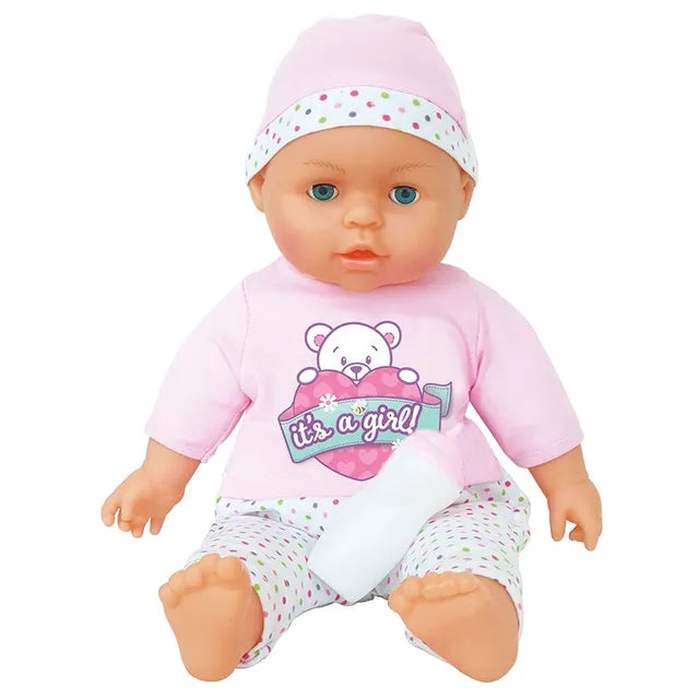 - 16-inch soft body doll set with iron stroller and feeding bottle.