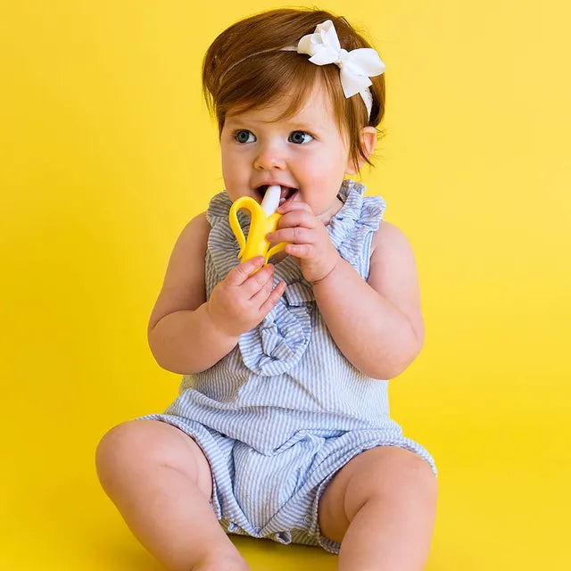 This fun and a-peel-ing toothbrush gently massages little teeth and gums with soft silicone bristles, which helps develop good oral hygiene habits early. It has easy-to-grasp banana peel handles, is made of 100% flexible silicone to prevent mouth injuries.