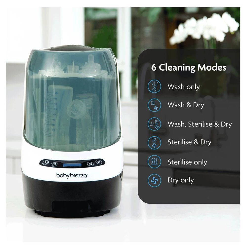 - 6 ECO-FRIENDLY CLEANING MODES: Choose from any combination of Wash, Sterilize & Dry; Uses 85% less water than hand washing; LCD control panel; Works only with Baby Brezza Detergent Tablets (machine comes with 60 FREE tablets)