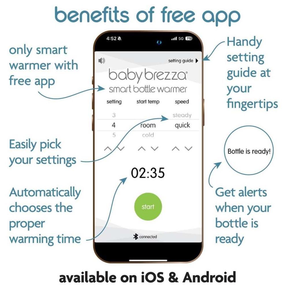 - FREE APP WITH SMART BLUETOOTH CONTROL: Use the free Baby Brezza app to operate the milk warmer & receive alerts on your iOS or Android phone when your bottle is ready; No more babysitting your bottle warmer