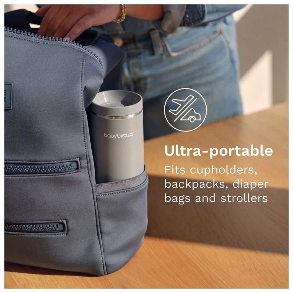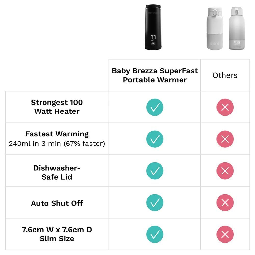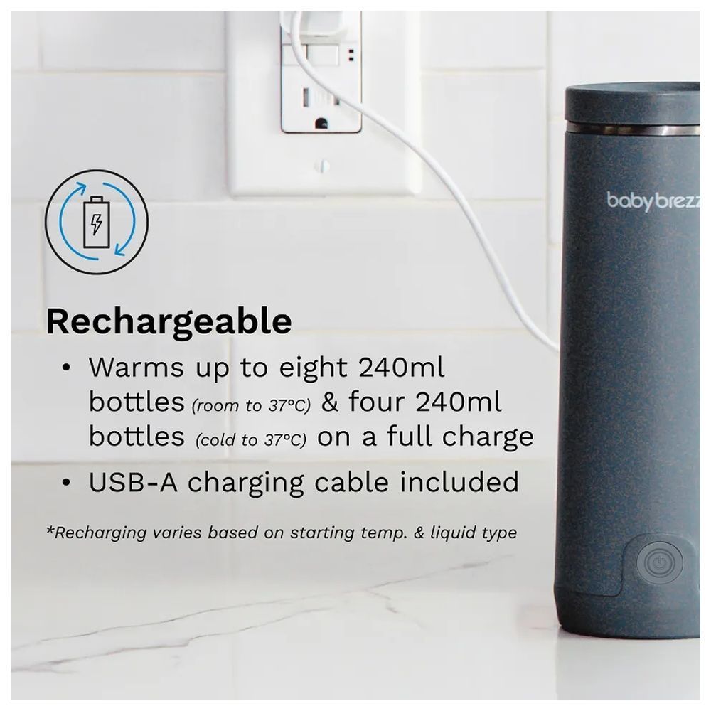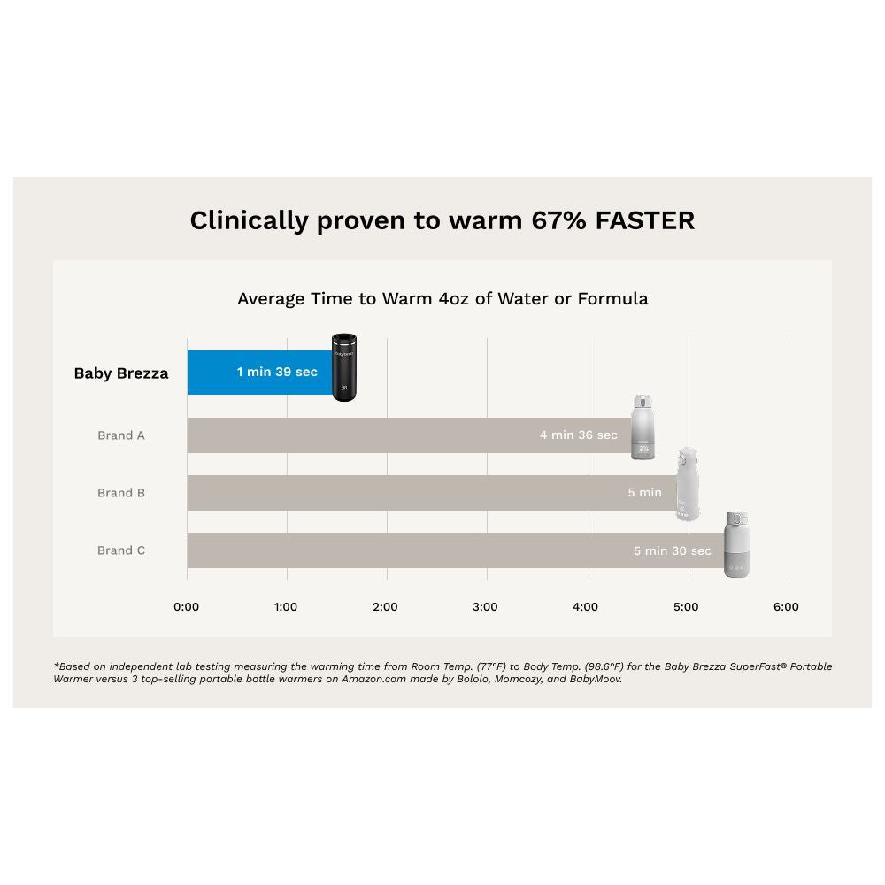 The Baby Brezza SuperFast Portable Bottle Warmer is the fastest, most advanced way to warm breastmilk, formula, water or a filled milk storage bag on the go. Now available in bold Black color. It's clinically proven to warm up to 67% faster than other portable warmers, including 8 oz in 3 minutes (from room temp to 98°F). Its Advanced Sensor Technology safely and evenly warms milk and formula from top to bottom, protecting nutrients. No more adapters, leaks or turning bottles upside down! This rechargeable travel warmer warms up to eight 6 oz bottles (from room temp to 98°F) on a full charge, and it easily fits in cupholders or bottle pockets in diaper bags and backpacks, cars and strollers. The interior stainless-steel cup holds 9 oz of liquid or a filled 6 oz milk storage bag, and the dishwasher safe lid features a 360° pour spout. Choose from 4 warming temperatures: 80°F, 98°F, 99°F, or 103°F. Includes USB-C charging cable. Full charging time is 3-5 hours depending on power adapter (not included). Use 20W charging block for fastest charging. Charges in 3 hours with 18W charging block & 5 hours with 10W charging block. 1 year limited warranty