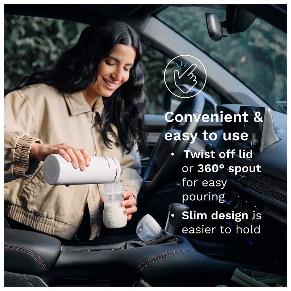 - CONVENIENT & EASY TO USE: No adapters, upside-down bottles or leaks like other portable warmers. Just add liquid inside & choose temperature. When done, warmer beeps & auto shuts off. Then pour liquid using 360° pour spout or by unscrewing lid