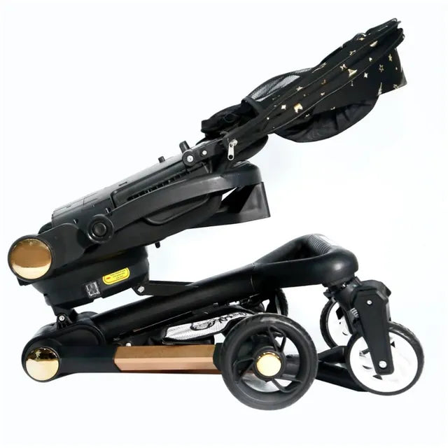 Baby's Nest 2 in 1 Stroller Black with Gold Compact Baby stroller that is lightweight, has a sunshade roof, and folds up like a carriage