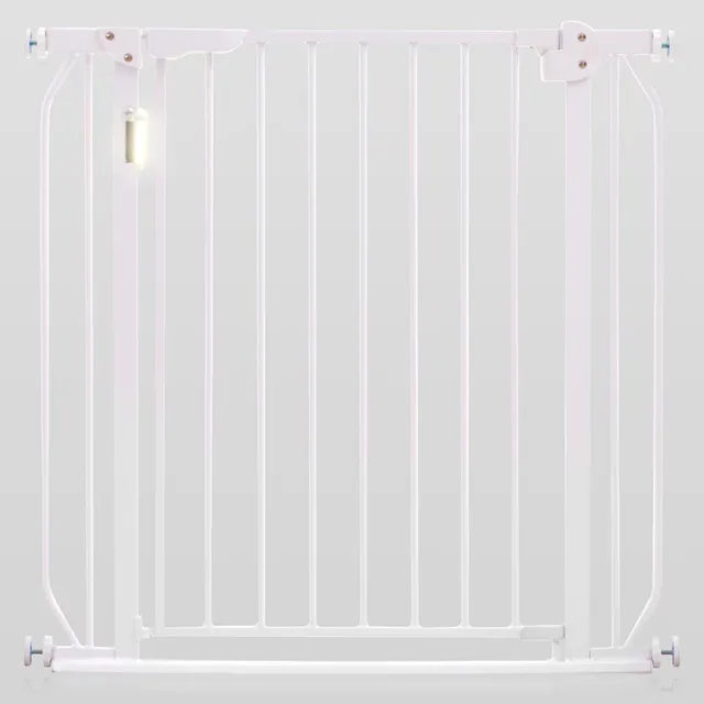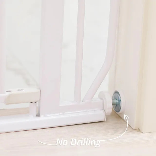 Assembly is quick and easy. The metal gate is clamped between walls or in door frames with fixing screws. No drilling required. LED light turns on when gate opens seeks extra attention and gives extra safety. With the Baby Safe Safety Gate with LED Light you can make your home more safe for your children or pets.