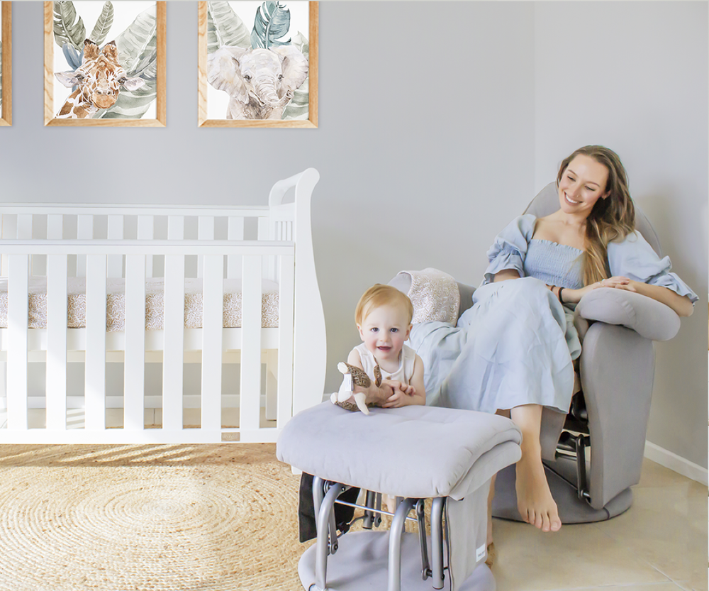Our Feeding Glider Chairs also offer an alternative to the bulky large recliners that are hard to fit in a nursery and even harder to climb out of, after each feed. You don’t need an extra hand with our gliders as they effortlessly lift you back to a full seating position, so you can easily step off, with your baby in your arms. This especially important for mums after birth, as often our bodies need a little help to sit up out of a chair.