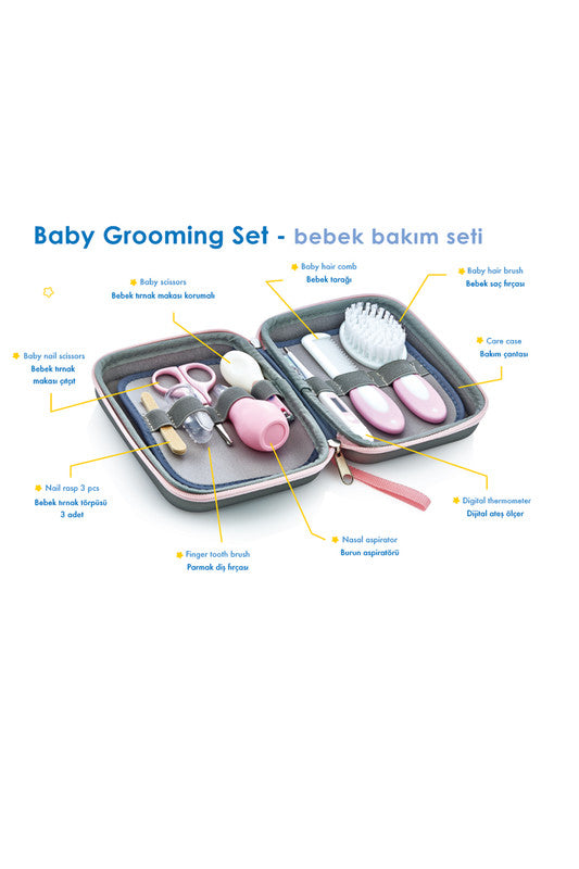 Baby grooming set for your little ones. It consists of baby nail scissors, baby hair brush care case, nail rasp, finger tooth brush, baby scissors, baby hair comb, digital thermometer and nasal aspirator. It is easy to carry and store with the portable pouch that comes along.