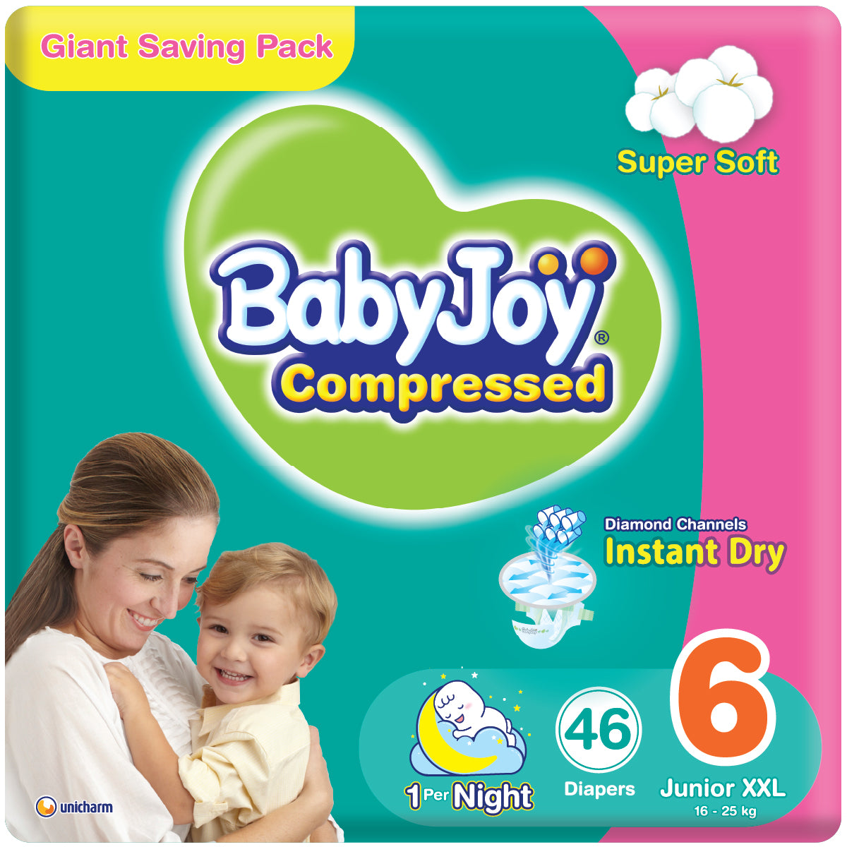BabyJoy diapers provide your baby with the comfort and freedom of movement it needs to grow healthy.Its Compressed Diamond Pad absorbs more wetness all night long for up to 12 hours, keeping your baby dry until morning