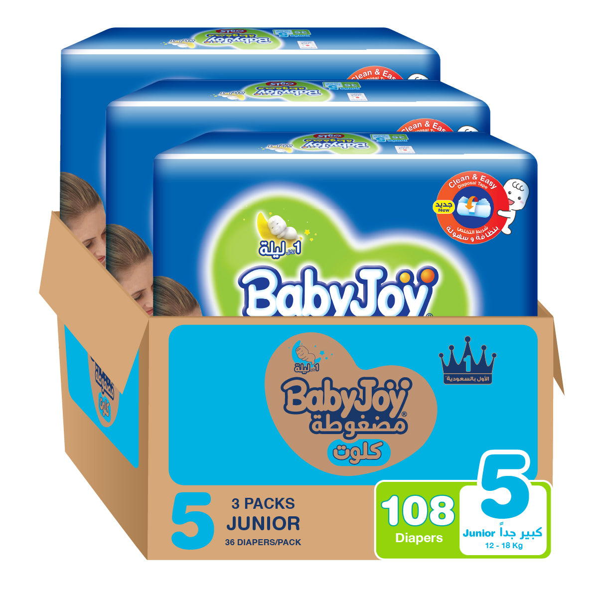 BabyJoy Cullotte Pants Diaper, Jumbo Pack Junior Size 5, 12 - 18Kg - 108Pcs