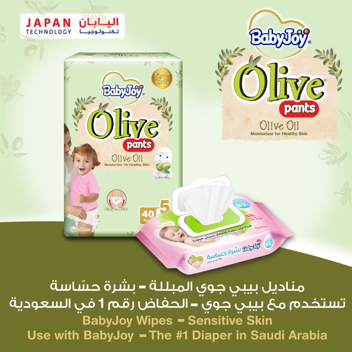 BabyJoy Olive, first in Saudi Arabia, is a diaper with olive oil that gently moisturizes your baby's skin all the time. Its compressed air channels absorb up to 6 cups of liquid, keeping your baby's skin dry and healthy.