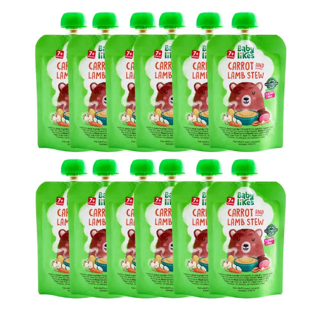 Babylikes Carrot and Lamb Baby Meal has ingredients, flavours and textures suitable for babies from 7 months. This baby meal is dairy-free. Babylikes Halal Baby Food Pouch - Carrot & Lamb Stew 130g Stage 2 Organic Baby Puree for 7+ months - 12-Pack