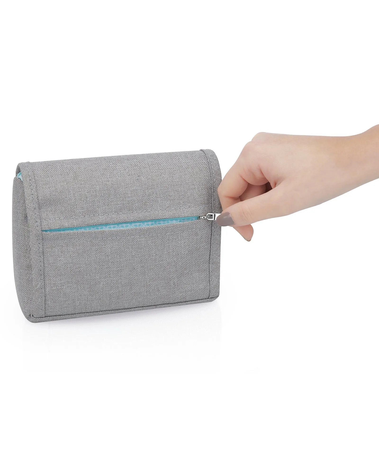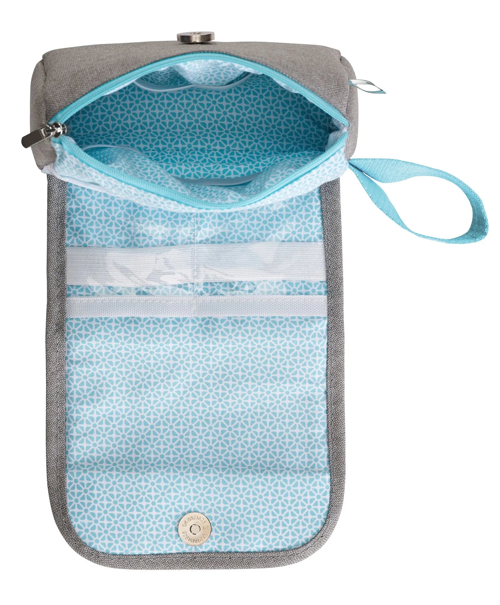 Very compact, this elegant marl baby care kit is ideal for trips out with baby. It slip easily into a pushchair, changing bag or even a handbag. This kit is in the shape of a large foldout pouch and contains the six essential accessories for taking care of baby: A brush, digital thermometer, pair of scissors, nail file, toothbrush and clear container. Practical, it contains several elasticated compartments on the inside to keep the accessories neat and tidy. Its outer zip pocket provides further storage that is easy to reach. Featuring a large handle for hanging, this baby care kit can be kept in your bathroom.