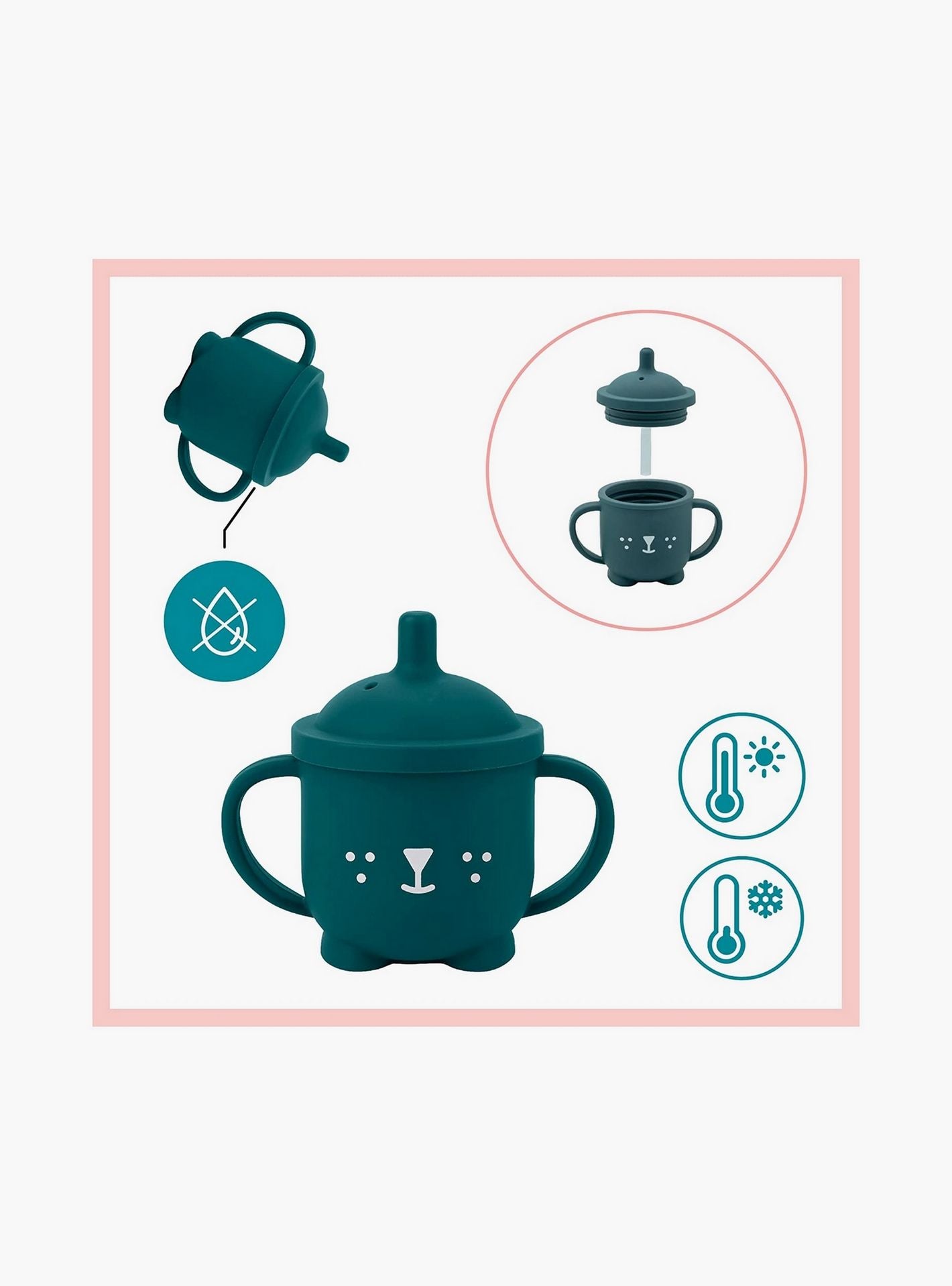 It has two small feet for better stability and less risk of falling. For use with or without the lid, it is ideal for warm or cold drinks. Really practical, the bib has a tummy pocket to catch falling food. Your baby can continue to learn whilst protecting their clothes.