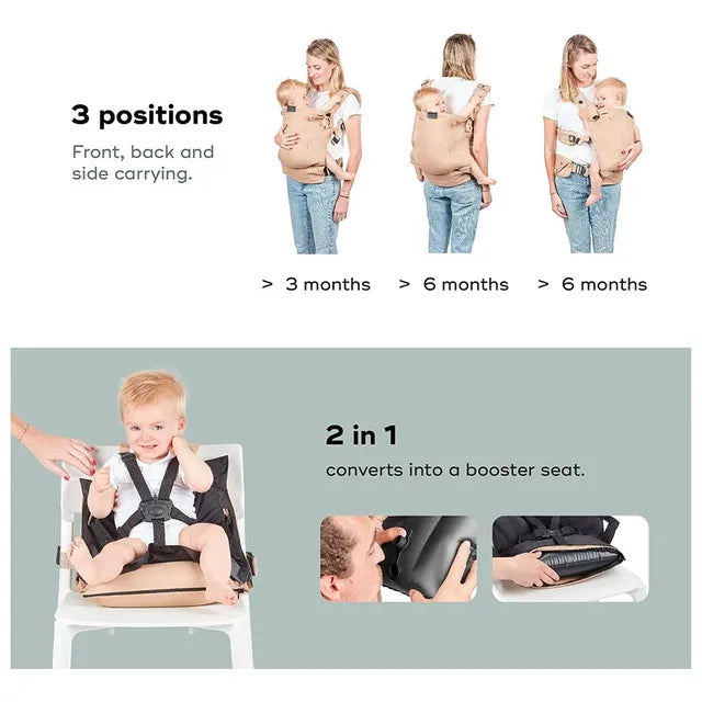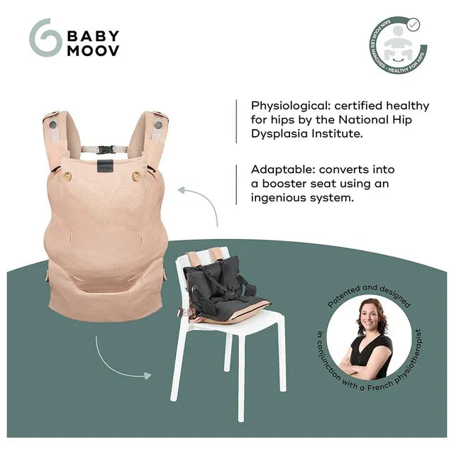 The only ergonomic baby carrier that converts into a booster seat! Make life easier by just taking one item with you for mealtimes as well as travelling. There is no compromise on comfort, health and safety as this adaptable baby carrier was designed in conjunction with Camille Rieu, a physiotherapist specialising in the development of children's motor skills and a mother to 2 children herself. , , With an ingenious patented system of detachable straps and an inflatable cushion, it takes less than 5 minutes to convert your baby carrier into a secure booster seat! And since we really have thought of everything, the Moov & Boost baby carrier converts into a shoulder bag so it's really easy to carry.