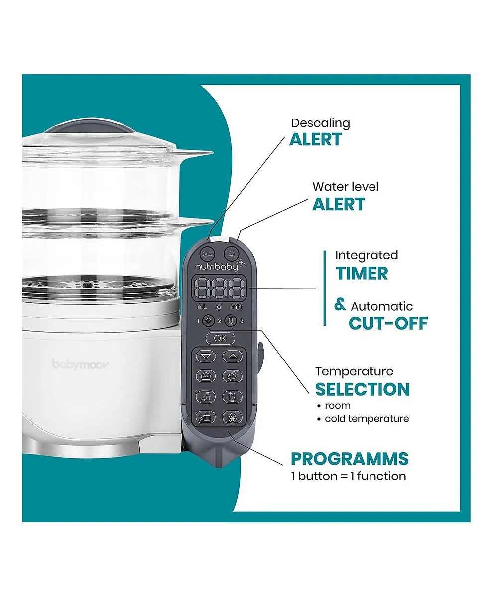 The Nutribaby+ has 6 pre-programmed functions: steam cooking, blending, defrosting, heating baby food jars, sterilising and heating baby bottles (up to 3 at the same time) ; 15 REUSABLE POUCHES: you store your baby's meals and easily feed him wherever you are. Eco-designed, they are reusable 20 times each, airtight and graduated ; PRESERVES NUTRIENTS: you can cook each type of food for different lengths of time using the separate baskets. The cooking water vessel means the vitamins and flavours are preserved ; ADAPTABLE: It delights your baby with meals suitable for weaning onto solids. The 3 blending speeds along with the cooking water vessel mean you can adjust the texture depending on your baby's age ; BATCH COOKING: you can prepare several meals at once with its 2.2-litre capacity (1,500 ml for cooking, 700 ml for blending). You can blend and cook at the same time or separately - it's up to you