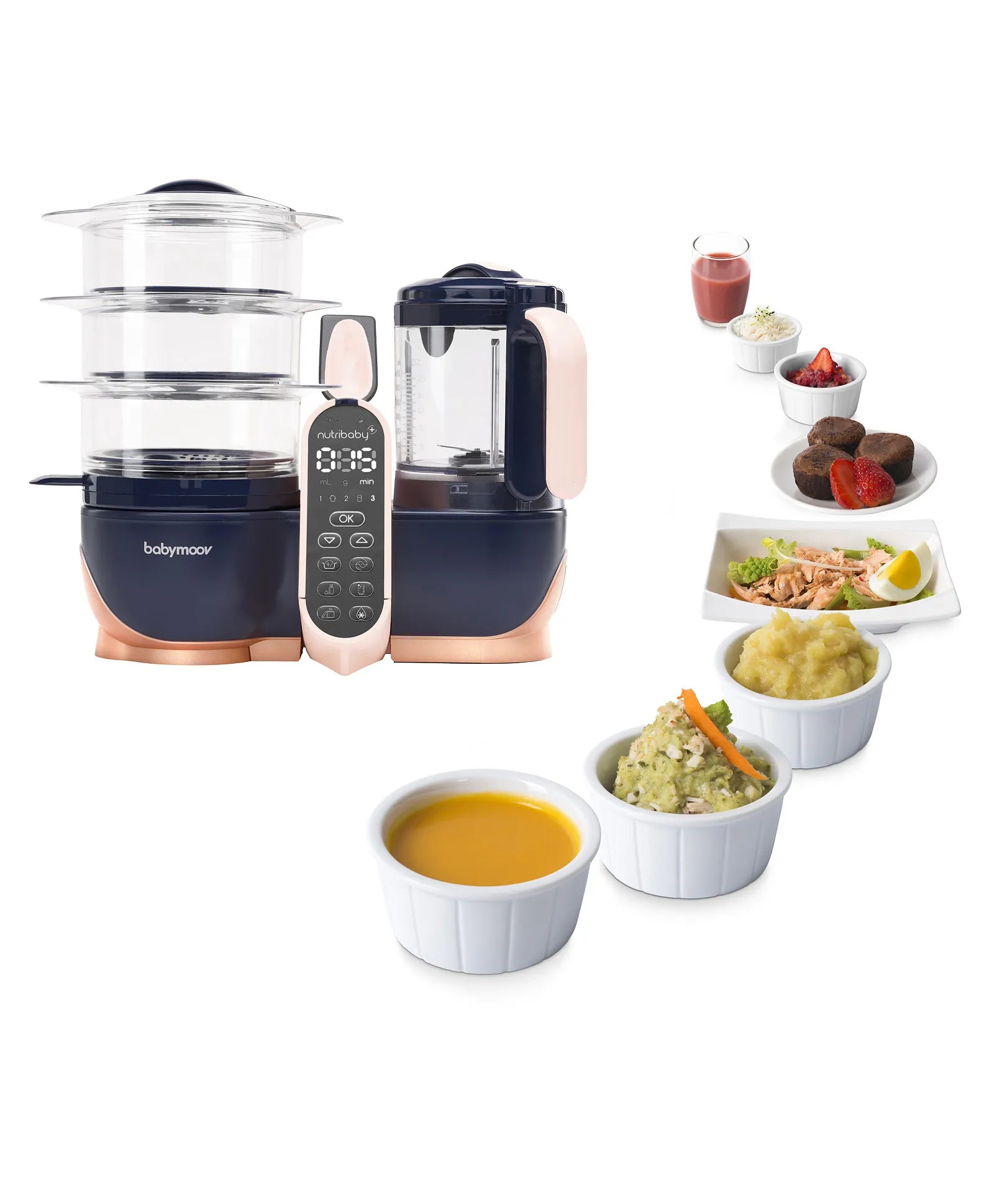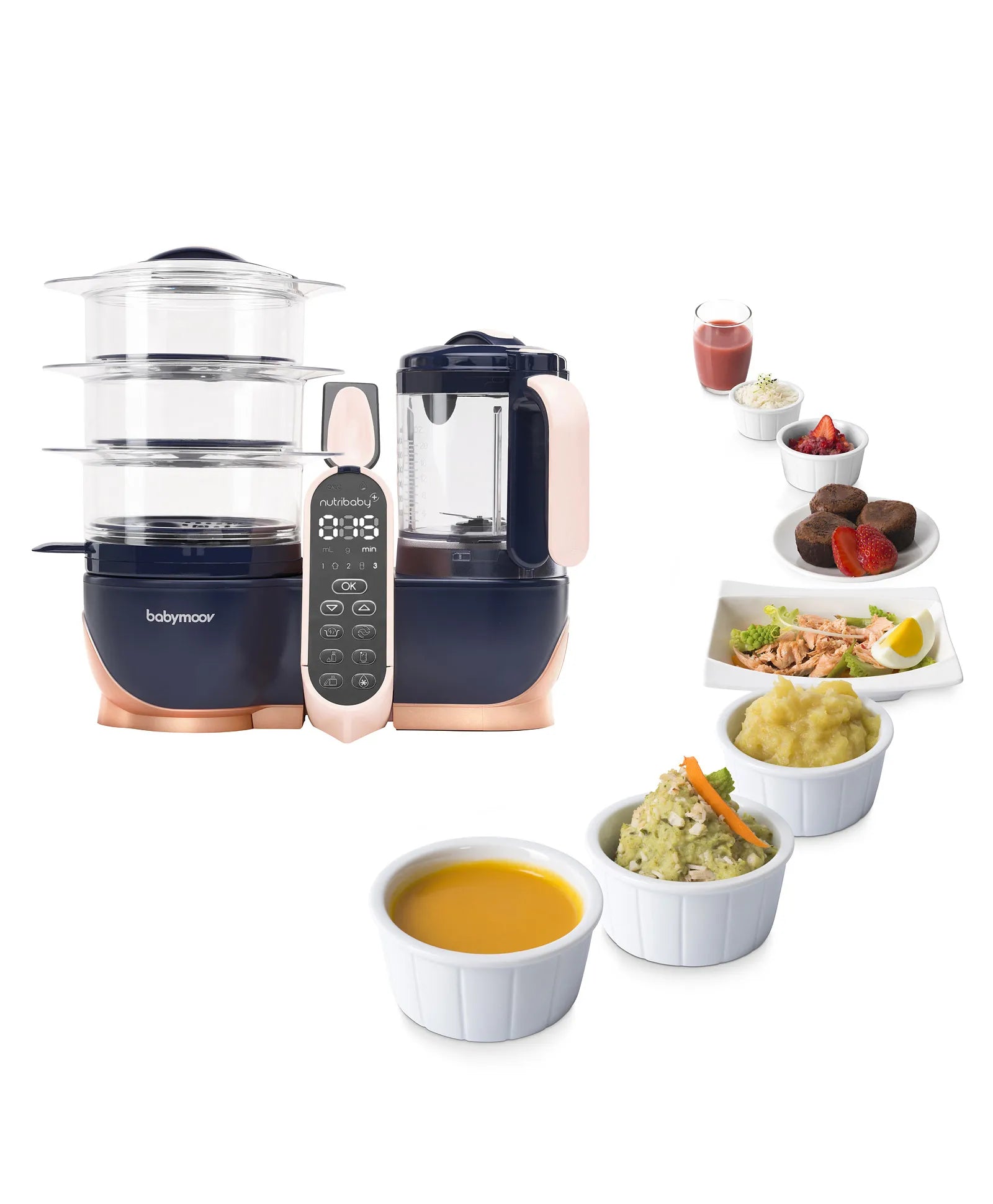 All-in-1, it supports all stages of your child's development, from pregnancy to food diversification and beyond Complete and clever: 5 functions in 1! The Nutribaby (+) XL allows you to: Heat Sterilize your baby bottles Steaming Multi Speed Blender/Mixer Defrost Ideal for the autonomous feeding of your baby, you prepare vegetables, meats, fish and even cereals necessary for its good development. Its 3 separate baskets allow you to cook each food at the right time and thus preserve their flavor and nutrients. You then adjust the texture and give even more taste and vitamins with the cooking juice kept in its independent recuperator. Recipe booklet included! After 6 months spent in a bottle or breastfeeding, your baby will finally gradually discover food diversification.