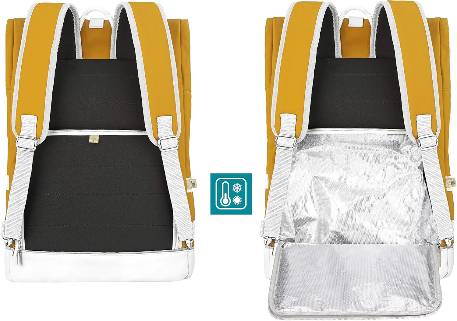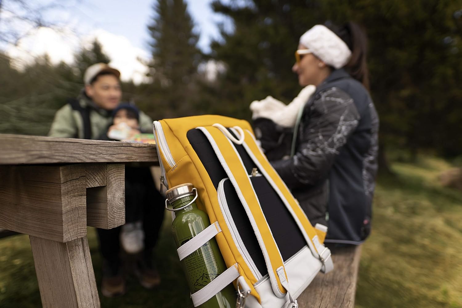 Inspired by hiking backpacks , The Le Sancy changing bag is inspired by hiking backpacks. It is designed to be adjustable, comfortable and practical. , There is a large insulated compartment at the base of the bag. This can be accessed directly from the back of the bag with a zip fastening. You can easily reach your child's food or your own picnic without the need to empty your entire bag. The weight is evenly distributed and the straps are adjustable, making it really comfortable to carry! You can pop a water bottle into the elastic straps on the side of the bag.