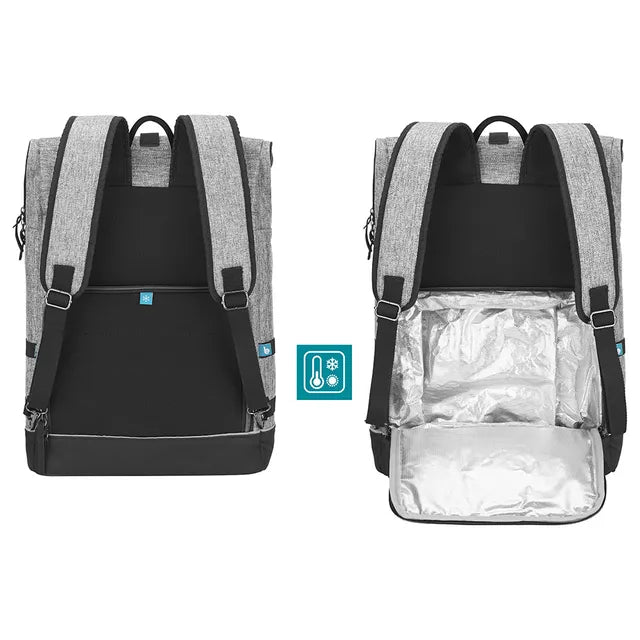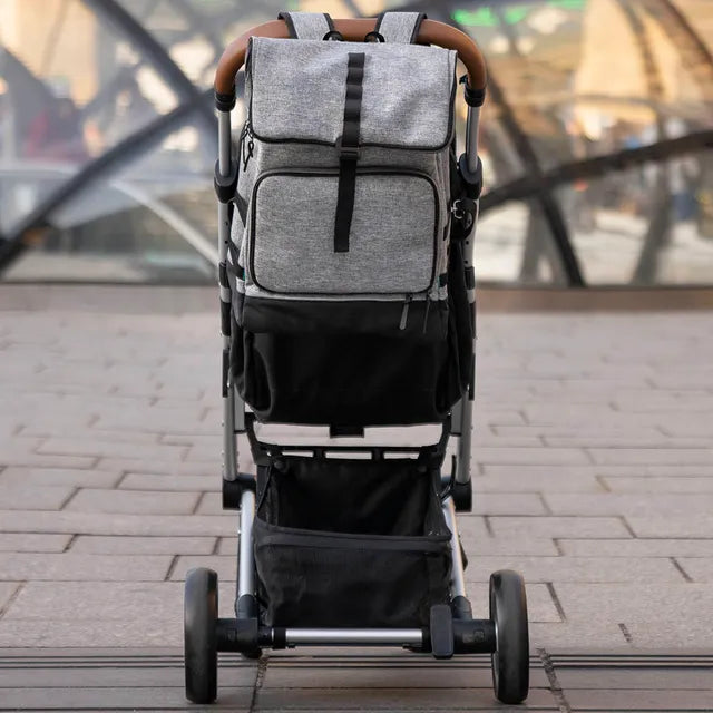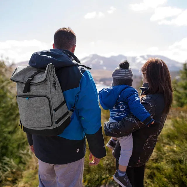 Inspired by hiking backpacks , The Le Sancy changing bag is inspired by hiking backpacks. It is designed to be adjustable, comfortable and practical. , There is a large insulated compartment at the base of the bag. This can be accessed directly from the back of the bag with a zip fastening. You can easily reach your child's food or your own picnic without the need to empty your entire bag. The weight is evenly distributed and the straps are adjustable, making it really comfortable to carry! You can pop a water bottle into the elastic straps on the side of the bag.