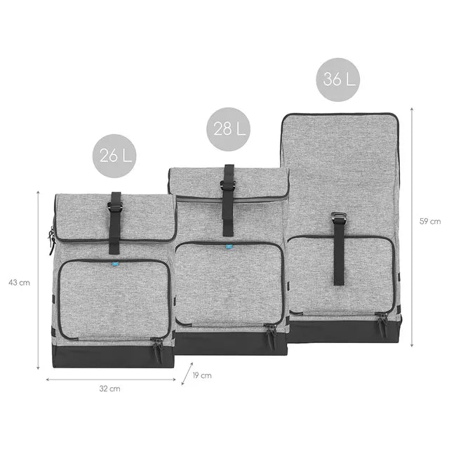 The changing pocket is on the front. Open it to unfold the removable changing mat. A towel is provided to make it easier to change your baby wherever you are. There are several storage compartments in the changing pocket to hold wipes, nappies, cream and other essentials. The Le Sancy is fully opening. This makes it easier for you to find your child's bodysuits, sweaters and changing equipment. And what about your things, as a parent? There is a hidden pocket at the top of the bag. You can store your mobile phone, documents and purse... all inside. A keyring is also included. This bag has a capacity of 26 to 36 litres. This means you can use it for days out as well as weekends away. Its water-repellent fabric means it stands up to all weathers.