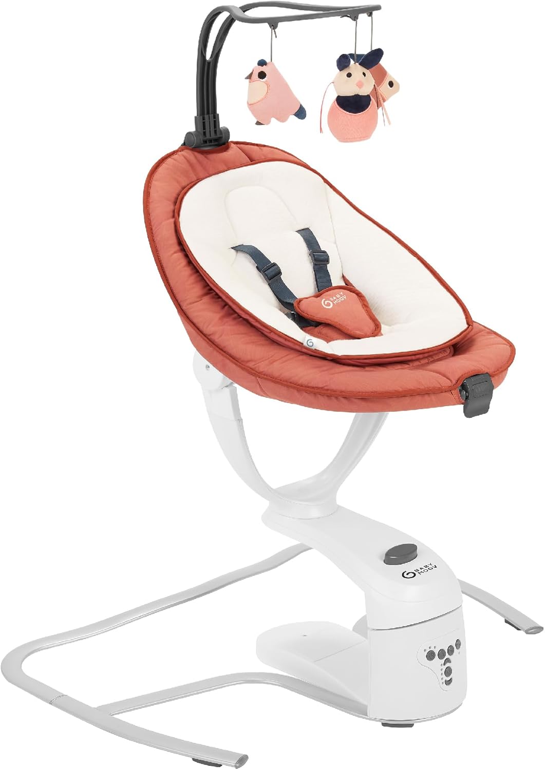 The ultra-comfortable 360° swing from birth ; Your baby has never been so soothed and cradled as in mom and dad's arms, but what can you do when there are a thousand and one things to do at the same time? The Babymoov Swoon Motion swing seat is the solution you need! With its 360° rotating seat, your baby discovers his environment, participates in family moments and always stays close to you. The motion sensor function allows the swing to automatically restart when your baby begins to fuss. The Swoon Motion swing has an adjustable arch made up of 3 toys and incorporates 8 lullabies to relax. For added safety, the Swoon Motion swing is equipped with a 5-point harness.