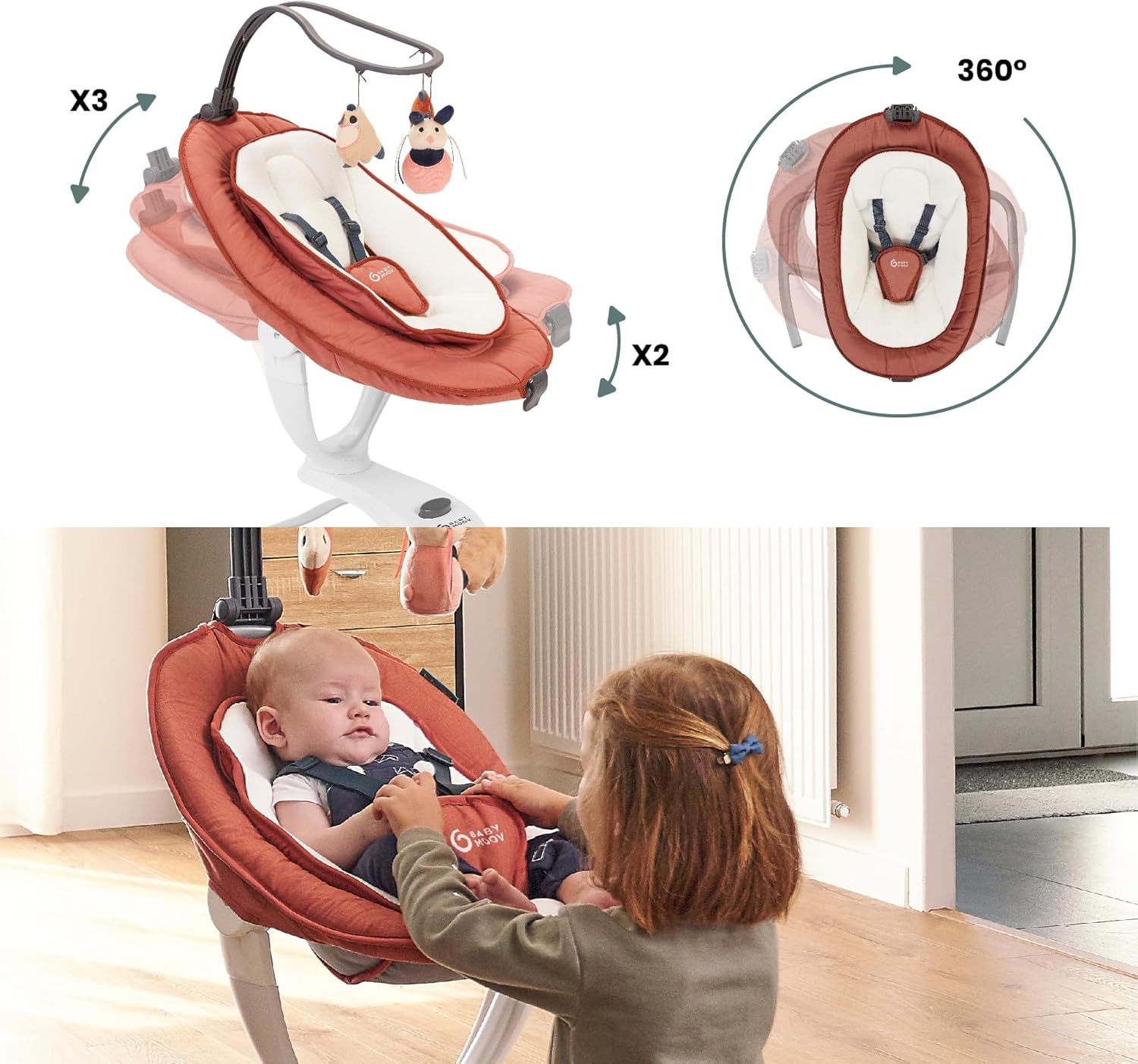 - 2 rocking modes (front-to-back and sideways), 5 rocking speeds and 3 seating positions to suit baby , 360° rotatable seat