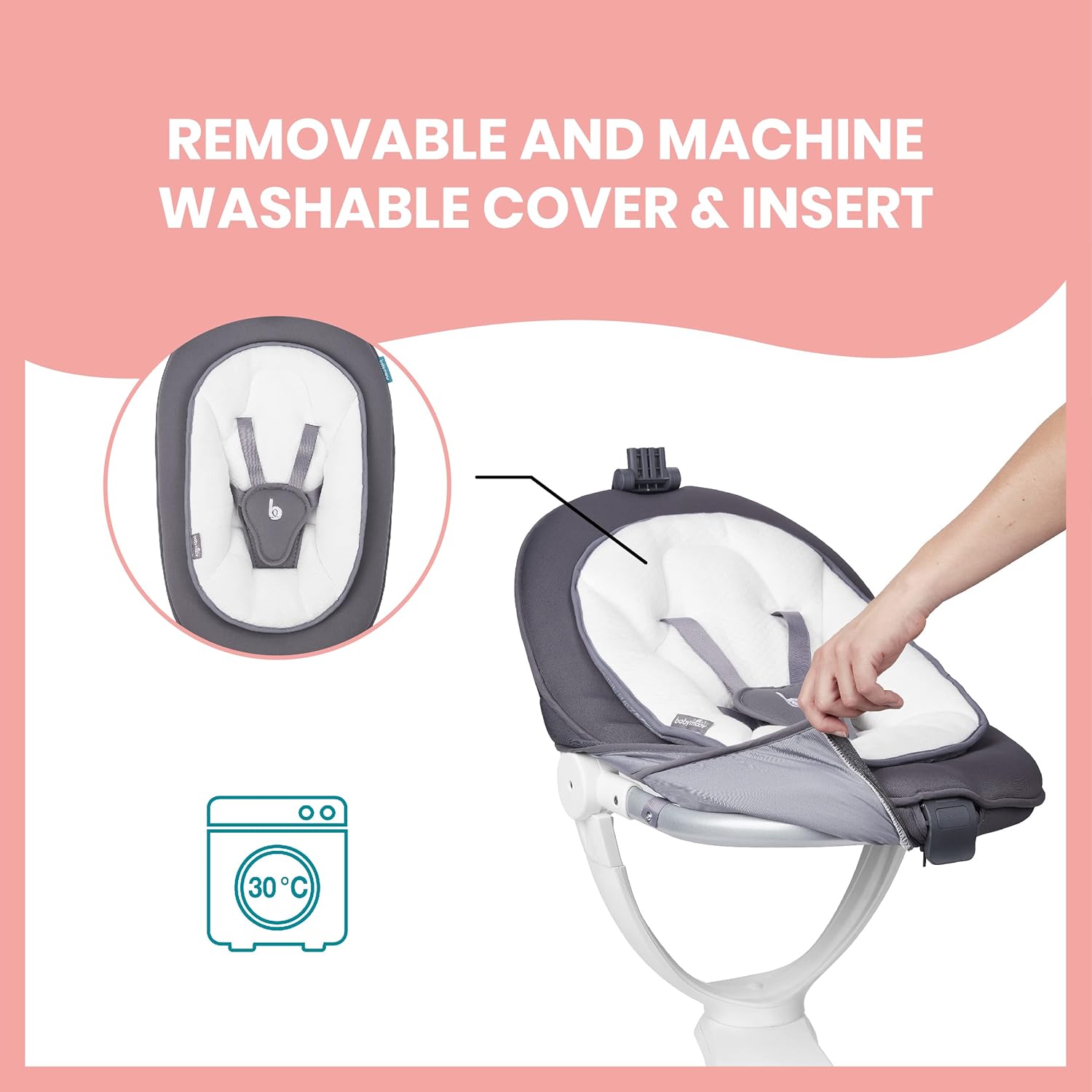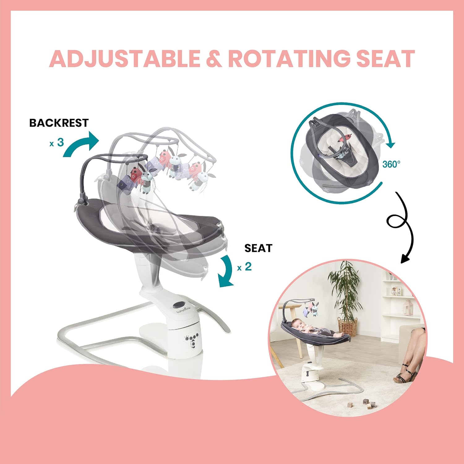 The ultra-comfortable 360 swing from birth ; Your baby has never been so soothed and cradled as in mom and dad's arms, but what can you do when there are a thousand and one things to do at the same time? The Babymoov Swoon Motion swing seat is the solution you need! With its 360 rotating seat, your baby discovers his environment, participates in family moments and always stays close to you. Thanks to its 2 rocking modes (lateral and front to back) and its 5 speeds, the swing gently rocks your baby as if he were in your arms.