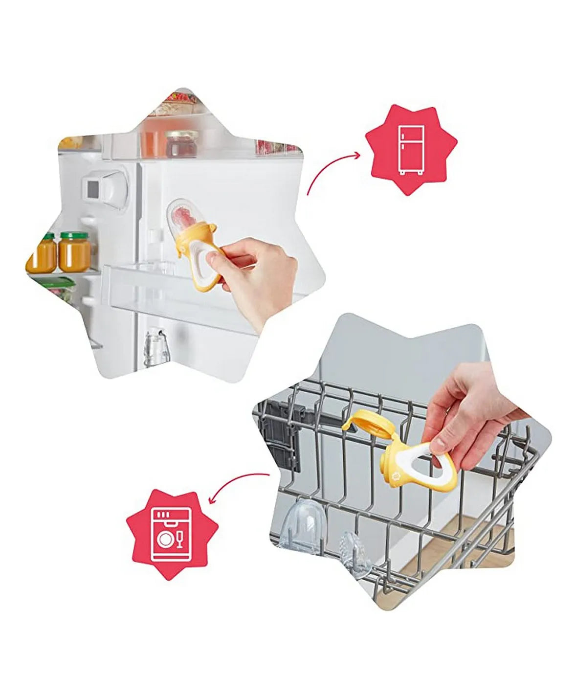 The essential for food diversification awakens tastes without risk! Even with the nibbler, your baby will wince the first time he tastes the kiwi!! With its non-slip handle and suitable size, the Badabulle nibbler is ideal for your little one to learn the different tastes on their own! Its food-grade silicone teat allows it to chew safely without ingesting solid pieces. With cold food in the teat, the nibbler even soothes your little one's teething pain. Its included cap allows you to take it everywhere with you! The tap or the dishwasher are enough to clean it! Little more, this set of 3 makes your life easier, always one at home, in the bag and at the grandparents! Discover the rest of the Badabulle gourmet collection for well-equipped meals