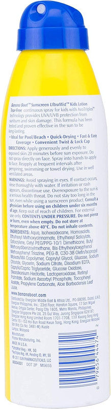 AVAILABLE IN SPF 50+For Ultra Fun in the Sun. Banana Boat sun care is the firstbrand to offer a tear-free, sting-free continuous spray. This lotion spray isso gentle, it won't irritate your child's eyes or skin. Plus, the white lotionlets Mom see where she's applied it - no more missed spots!FEATURES amp BENEFITSBroad-spectrum UVA and UVB protectionWater-resistant for up to 80 minutesTear-free and alcohol-free, won't sting eyes6oz. UltraMist lotion spray canTwist 'n Lock Spray, no cap!