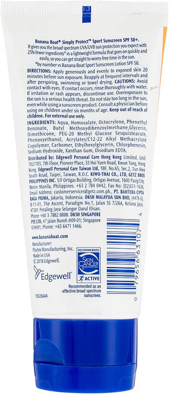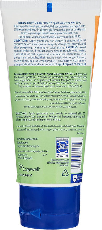 Banana Boat Simply protect Sport lotion is AVAILABLE IN SPF 50+ Designed for those who lead active lifestyles, Banana Boat Simply Protect Sport delivers sport-strength protection with fewer ingredients to stand up to all your outdoor activities. Simply Protect Sport has a water and sweat-resistant formula that provides lightweight safe and effective broad-spectrum UVA/UVB protection with 25% fewer ingredients* - giving you just what you need to keep up with your family.