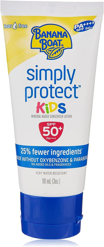 Banana Boat Simply Protect Kids sunscreen offers the same durable protection you've come to expect from Banana Boat, with 25% fewer ingredients ( by number vs. Banana Boat Sport Lotion SPF 50+). The mild, tear-free formula goes on quickly and easily (without the tears) so your kids can get straight to the fun. Banana Boat Simply Protect provides worry-free sun protection that stays on through 7 conditions: sun, pool water, ocean water, wind, sweat, sand and even 100-degree heat.
