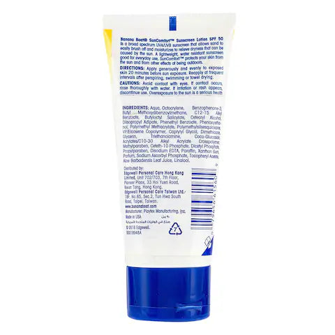 Banana Boat® Suncomfort™ Sunscreen Lotion SPF 50 is a broad spectrum UVA/UVB sunscreen that allows sand to easily wash away sand and moisturizes to eliminate dryness that can be caused by the sun. A lightweight, water-resistant sunscreen is good for daily use. Suncomfort™ protects your skin from sunlight and other external effects.