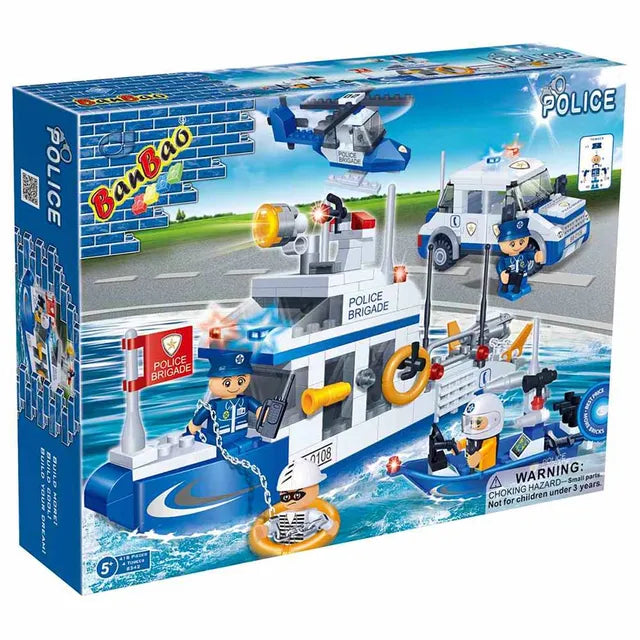 8342 Police series police boat police car complete building block set for kids. The Police Coast Guard watches over the harbour and beach of BanBao city. With the police vehicle you patrol over the boulevard next to the beach. The police boat does its duty in the harbour and the helicopter keeps an eye on things from the sky. Criminals that think they can get away, need to think again! With the Police Coast Guard the harbour and beach is free from crime! Help the police force and become a true police officer! This set contains the police boat, rescue boat, police car, helicopter, 3 police officers, 1 criminal and other accessories. The set contains 418 pieces and 4 ToBees figurines.